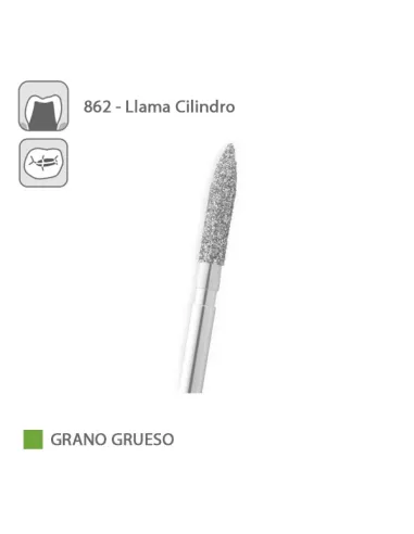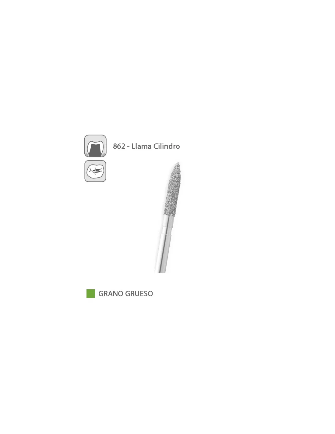 La fresa 862 de Medicaline es una fresa diamantada FG para turbina, con forma de cilindro llama. El tamaño del grano es grueso (color verde). Existen 2 diámetros de llama diferentes.