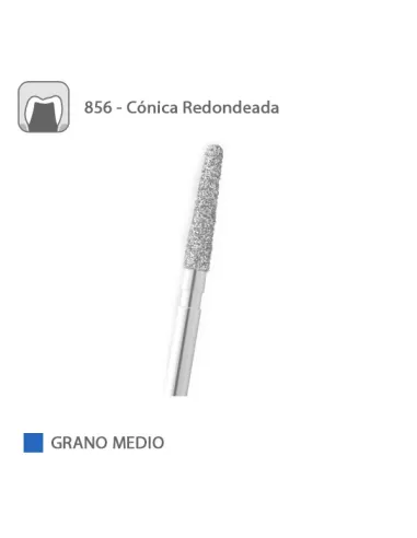 La fresa 856 de Medicaline es una fresa diamantada FG para turbina, con forma de cono redondeado. El tamaño del grano es medio (color azul). Existen 4 diámetros de cono diferentes.