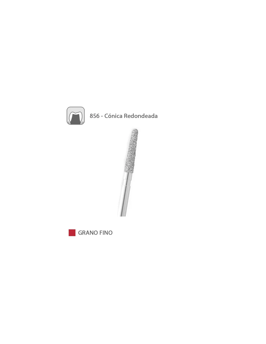 La fresa 856 de Medicaline es una fresa diamantada FG para turbina, con forma de cono redondeado. El tamaño del grano es fino (color rojo). Existen 4 diámetros de cono diferentes.