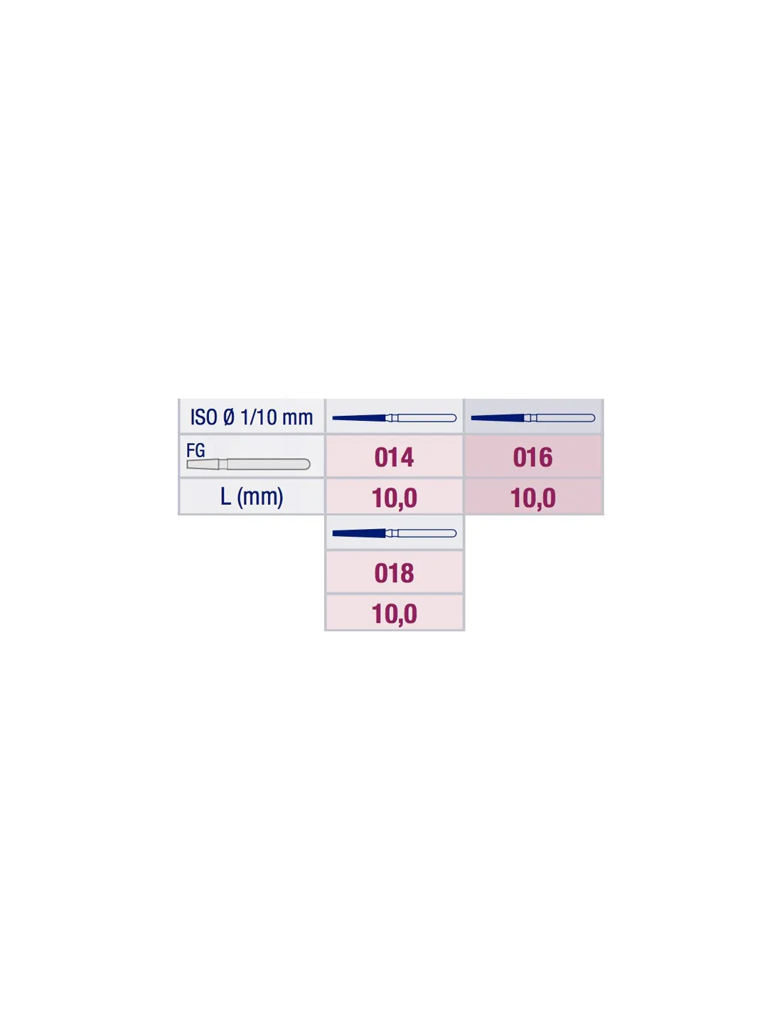 La fresa 848 de Medicaline es una fresa diamantada FG para turbina, con forma de cono largo. El tamaño del grano es grueso (color verde). Existen 3 diámetros de cono diferentes.