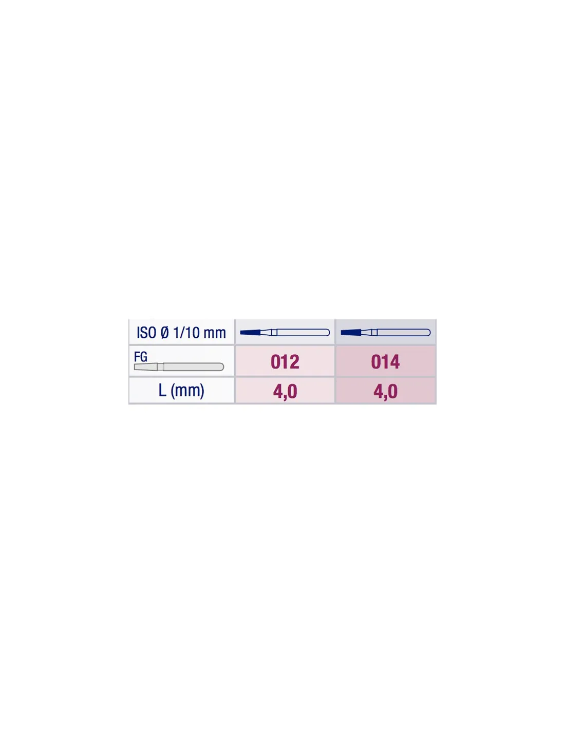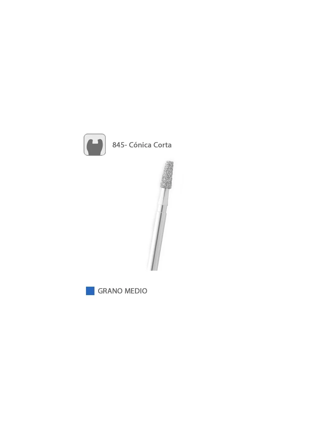 La fresa 845 de Medicaline es una fresa diamantada FG para turbina, con forma de cono corto. El tamaño del grano es medio (color azul). Existen 2 diámetros de cono diferentes.