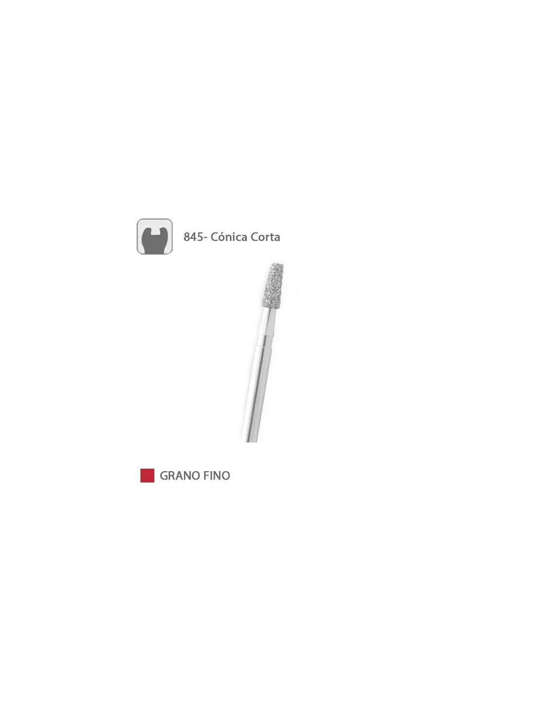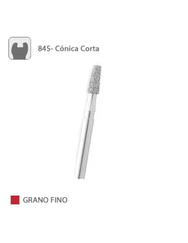La fresa 845 de Medicaline es una fresa diamantada FG para turbina, con forma de cono corto. El tamaño del grano es fino (color rojo).