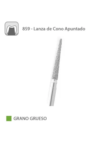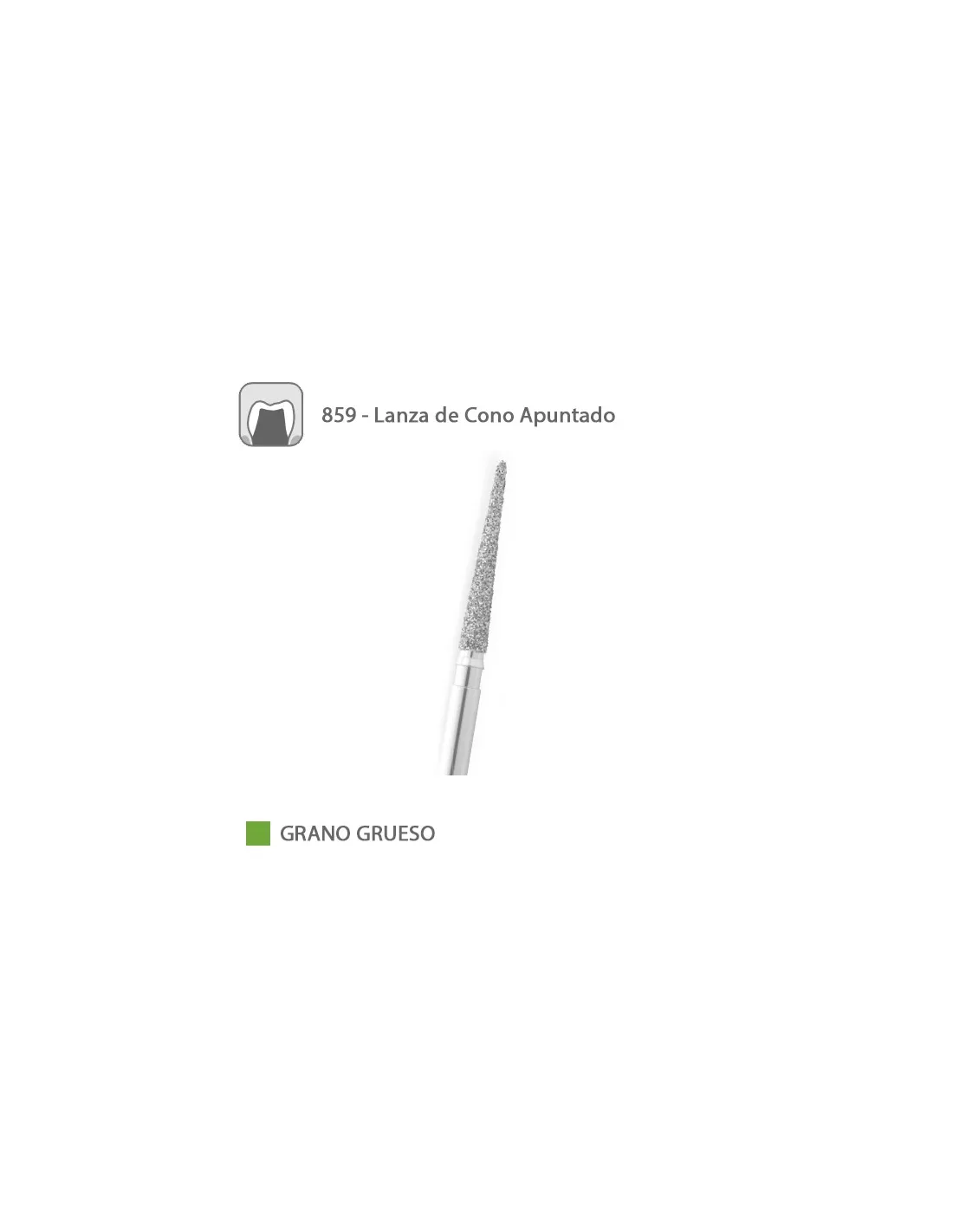 La fresa 859 de Medicaline es una fresa diamantada FG para turbina, con forma de lanza de cono apuntado. El tamaño del grano es grueso (color verde). Existen 3 diámetros de cono diferentes.