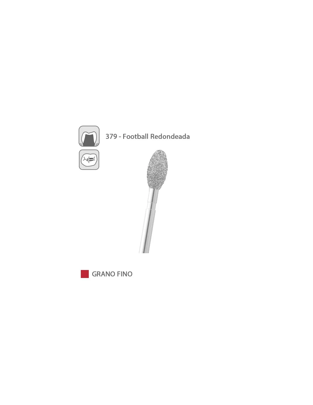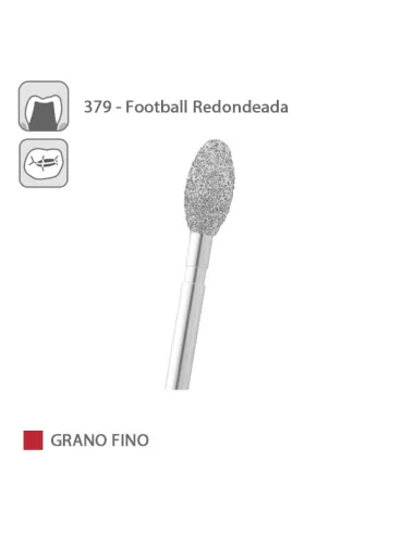 La fresa 379 de Medicaline es una fresa diamantada FG para turbina, con forma de football redondeada. El tamaño del grano es fino (color rojo). Existen 2 diámetros diferentes.