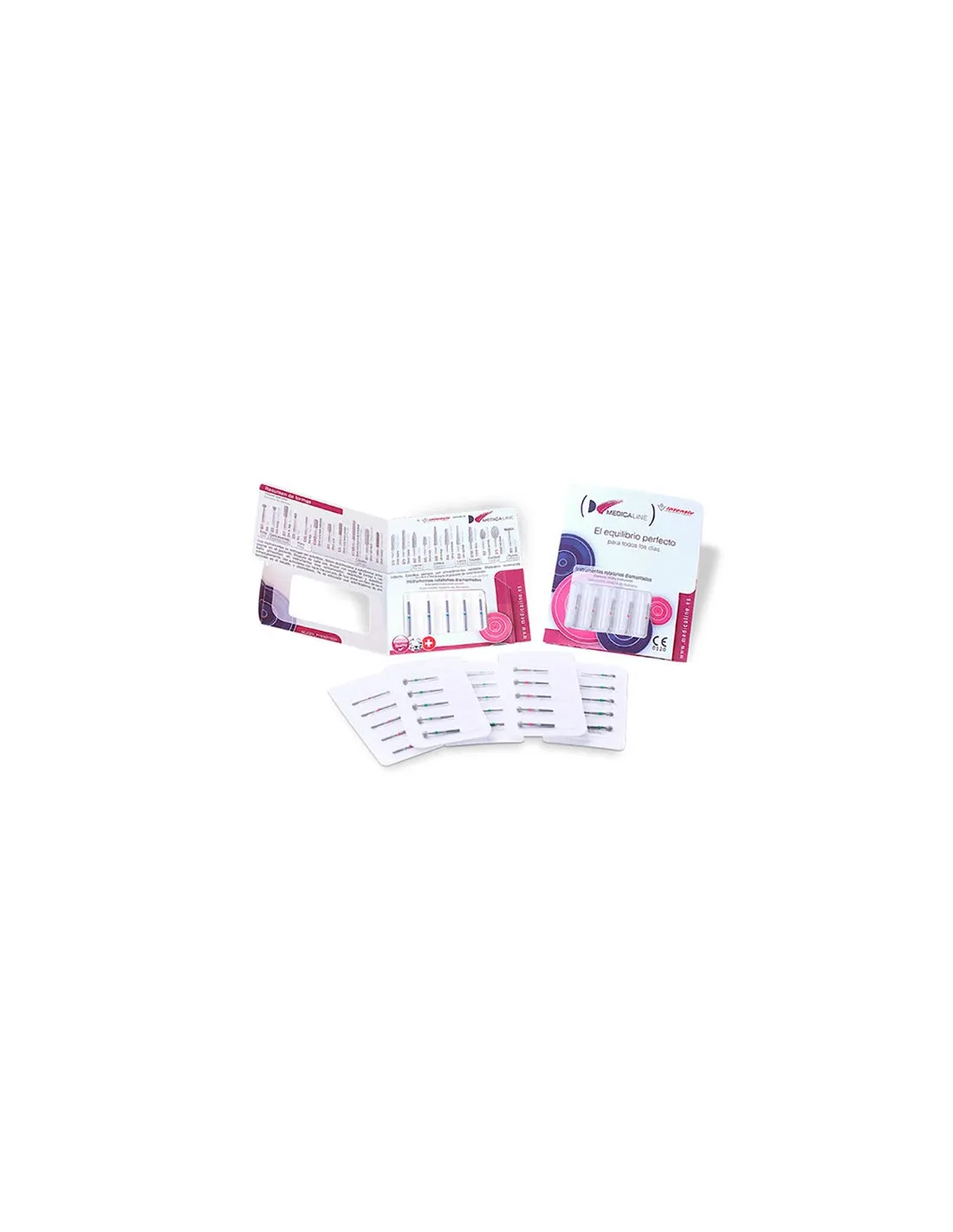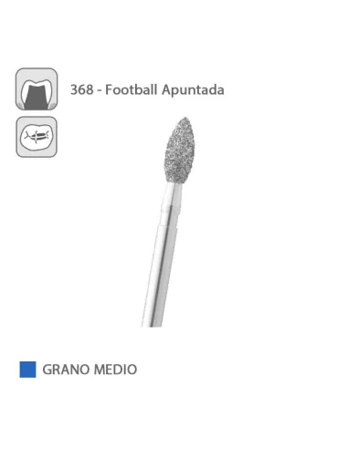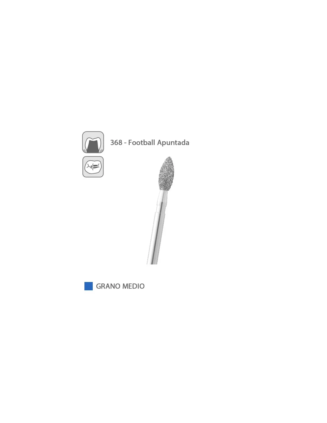 La fresa 368 de Medicaline es una fresa diamantada FG para turbina, con forma de football apuntada. El tamaño del grano es medio (color azul). Existen 3 diámetros diferentes.