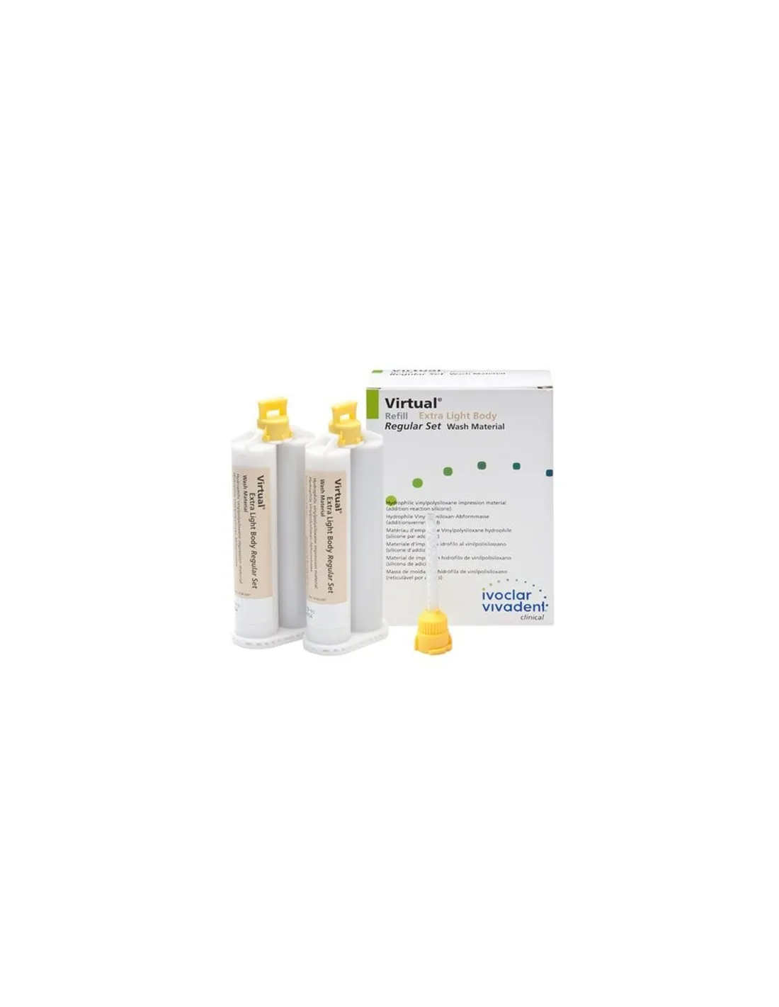 El envase de Virtual Extra Light Body contiene 2 cartuchos de 50 ml + 12 puntas de mezcla amarillas.