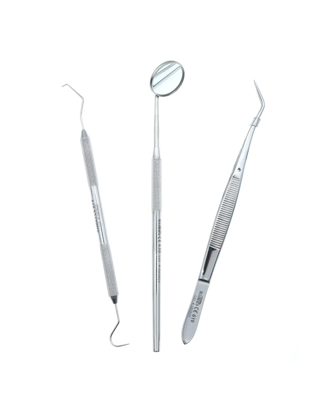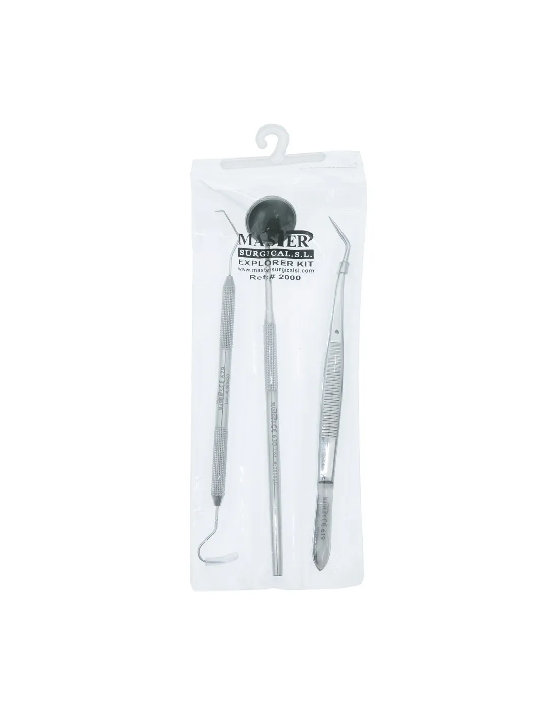 El kit de exploración de Masters contiene un explorador doble, un espejo con mango cone socket y una pinza de exploración, los 3 instrumentos están fabricados con acero inoxidable.
