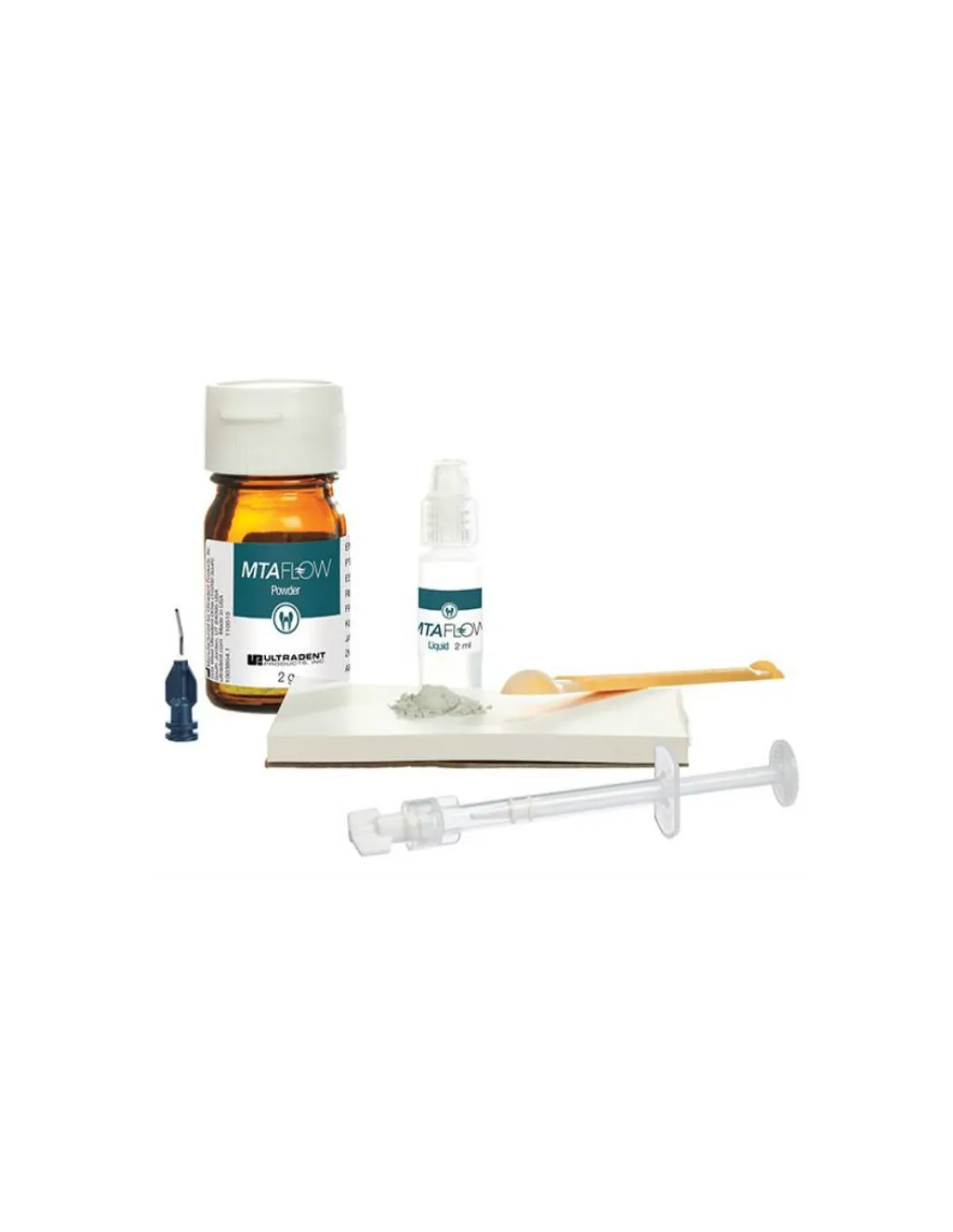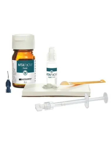 El kit Endo-Eze MTAFlow de Ultradent contiene: 20 gr polvo + 20 ml gel + accesorios.