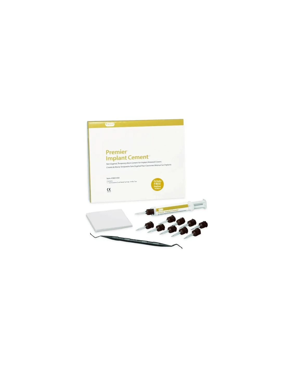 El envase de Premier Implant Cement de Premier contiene 1 jeringa automix + 10 puntas + accesorios.