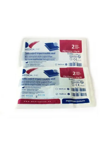 Estas tallas esterilizadas son impermeables y poseen 2 capas. Compuestas por 25g de Viscose y 25g de PE (polietileno), estas tallas de Medicaline están disponibles en talla L: 75x90cm.