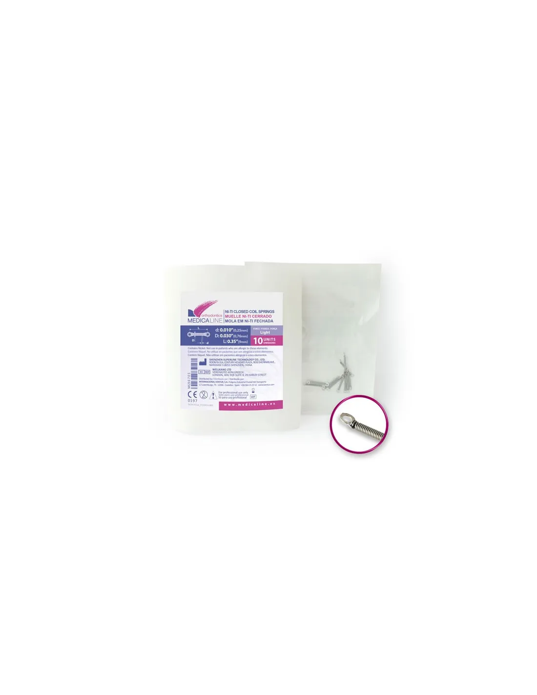 Los Coils de Medicaline están fabricados en níquel-titanio, son flexibles y de fuerza constante. Están disponibles en fuerza light o medium, y en 2 tamaños para facilitar su uso según necesidades: