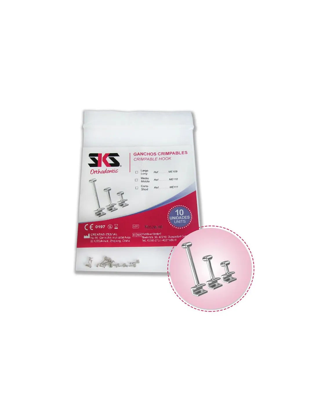 Ganchos Hook Crimpables para arcos de SKS Dental, accesorio muy útil en ortodoncia quirúrgica para facilitar el manejo de las piezas durante la cirugía. Los hooks también se fijan al bracket para asegurar el bloqueo de los arcos al colocar los elásticos.