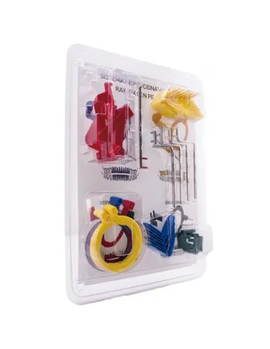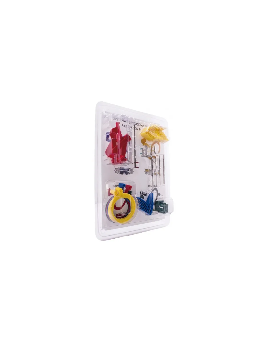 Este completo Kit Posicionador Radiográfico incluye 5 brazos, 5 anillos, y 19 bloques de mordida: 4 anterior (azul), 8 posterior (amarillo), 5 de bitewing (rojo) y 2 endo (verde).