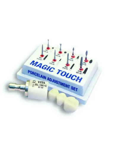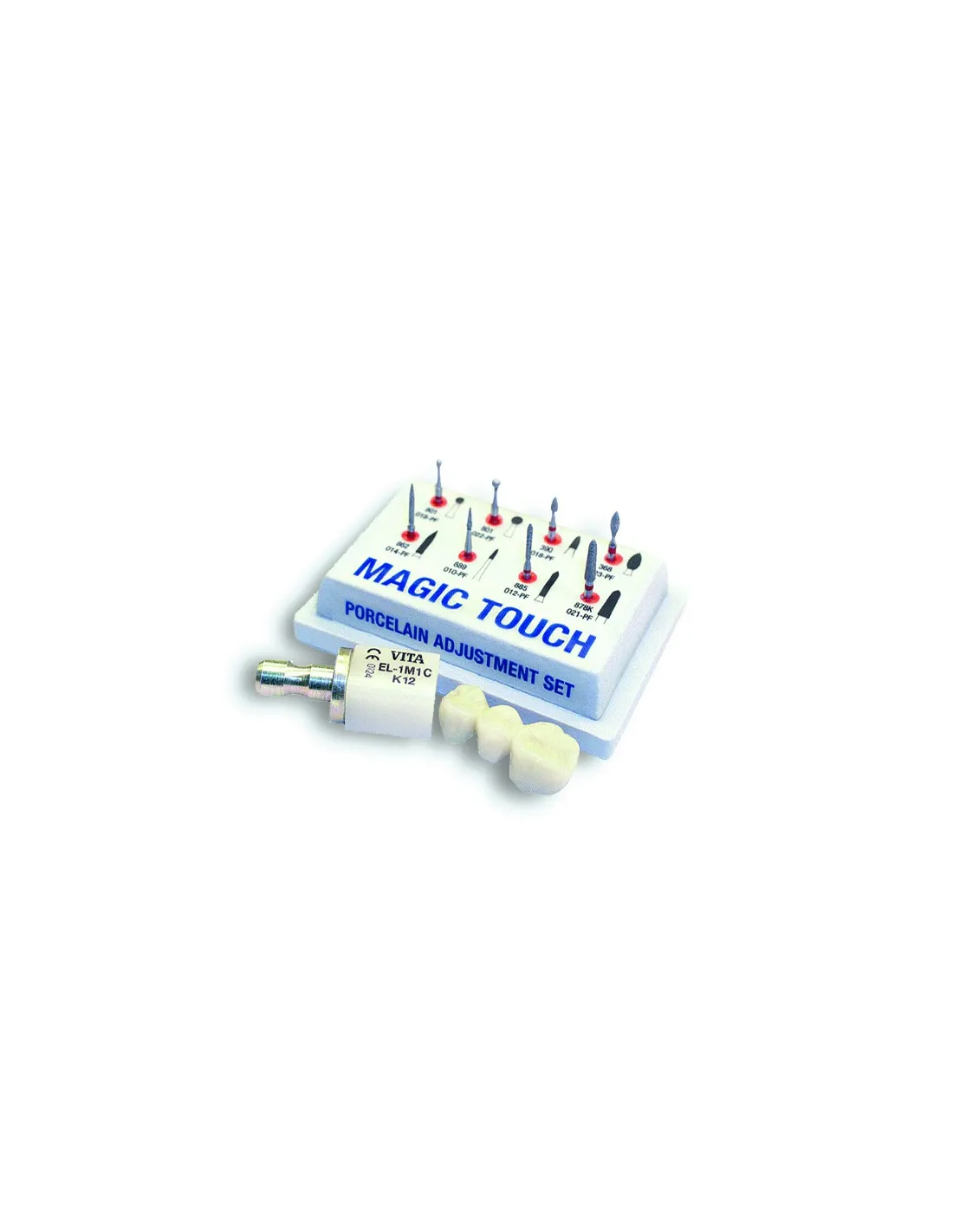 Kit “Magic Touche” de Strauss de 8 fresas diamante para turbina está indicado para el tratamiento de prótesis. Permite cortes y ajustes precisos en todo tipo de coronas y puentes de cerámica.