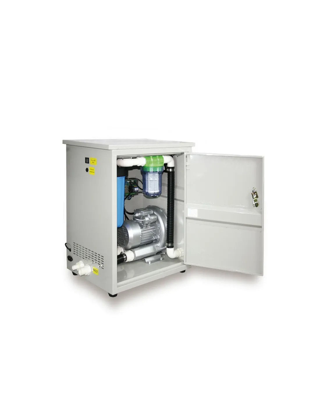 Su estructura en acero inoxidable, de tamaño compacto, peso ligero y mínimo ruido, hace que la unidad de aspiración con carenado se adapte fácilmente al espacio de trabajo, teniendo un mejor funcionamiento si es colocado cerca de la unidad dental.