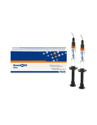 GrandioSO Flow de VOCO es un composite fluido universal nano-híbrido, de viscosidad media, de comportamiento de fluidez excelente con un mojado total de las paredes cavitarias. Indicado para restauraciones de las clases I a V. Restauración mínimamente invasiva. Sellado de fisuras y relleno de socavados. También utilizado para bases, recubrimiento o reparaciones de restauraciones y frentes. Fijación de prótesis translúcidas y bloqueado así como en ferulización de dientes.