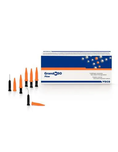 GrandioSO Flow de VOCO es un composite fluido universal nano-híbrido, de viscosidad media, de comportamiento de fluidez excelente con un mojado total de las paredes cavitarias. Indicado para restauraciones de las clases I a V. Restauración mínimamente invasiva. Sellado de fisuras y relleno de socavados. También utilizado para bases, recubrimiento o reparaciones de restauraciones y frentes. Fijación de prótesis translúcidas y bloqueado así como en ferulización de dientes.