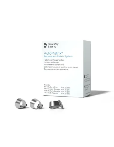 Las matrices sin retenedor Automatrix de Dentsply son matrices metálicas retenedoras preformadas de un solo uso para conseguir un buen punto de contacto. Indicadas para la reconstrucción clase II en premolares y molares.