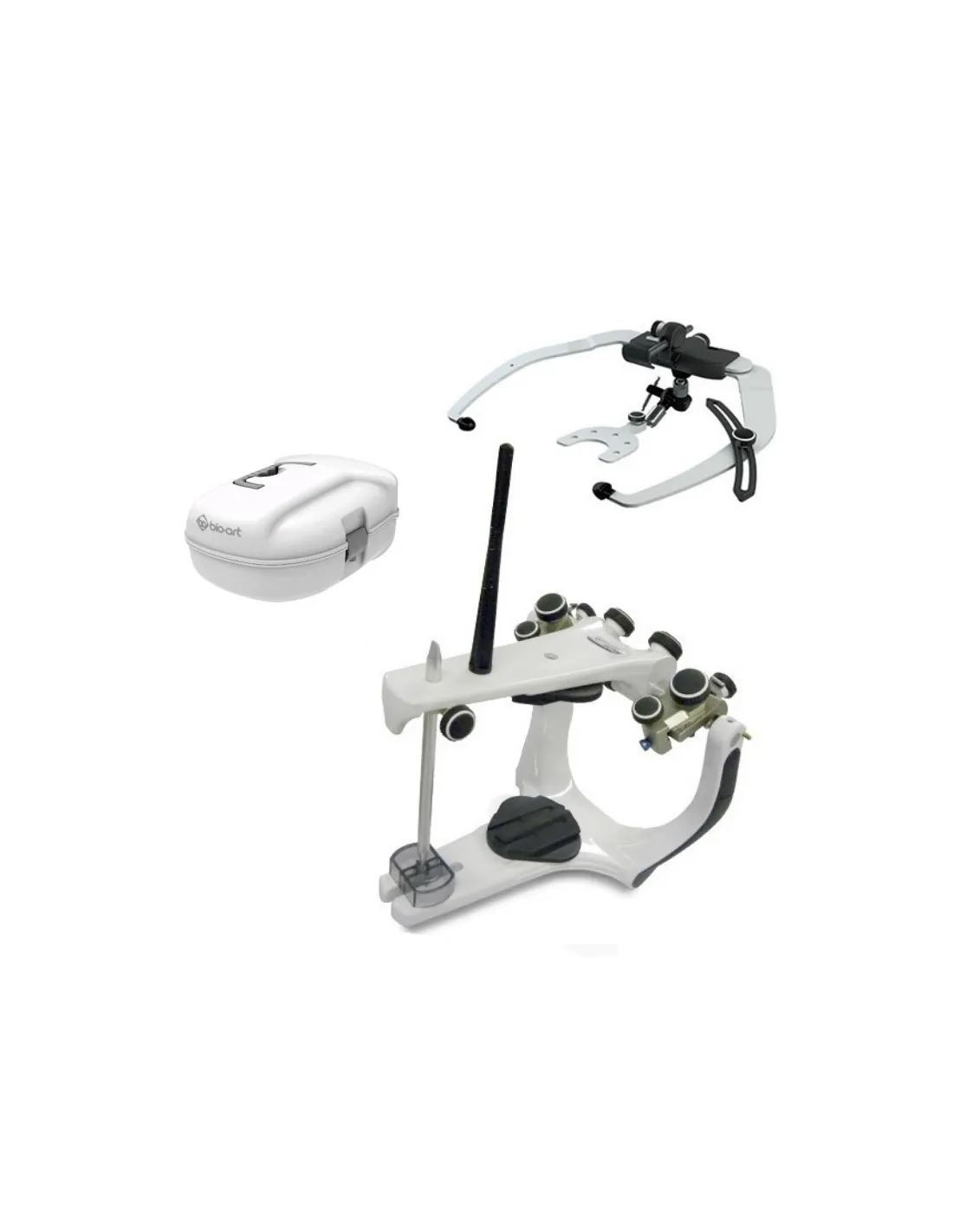 Kit ahorro de sistema de articulación maxilo-facial, compuesto por articulador A7 Plus E, arco facial Elite y estuche de transporte de Bio-Art.