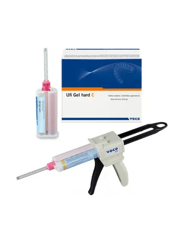 Ufi Gel Hard C de Voco es un material de rebase rígido, duradero y polimerizable en frío a base de polimetacrilatos. No desarrolla calor al fraguar en la cavidad bucal, por lo que el ajuste es correcto. No contiene MMA, es de sabor y olor neutros, y tiene un color estético y estable. Además se pueden añadir nuevas capas a cualquier hora.