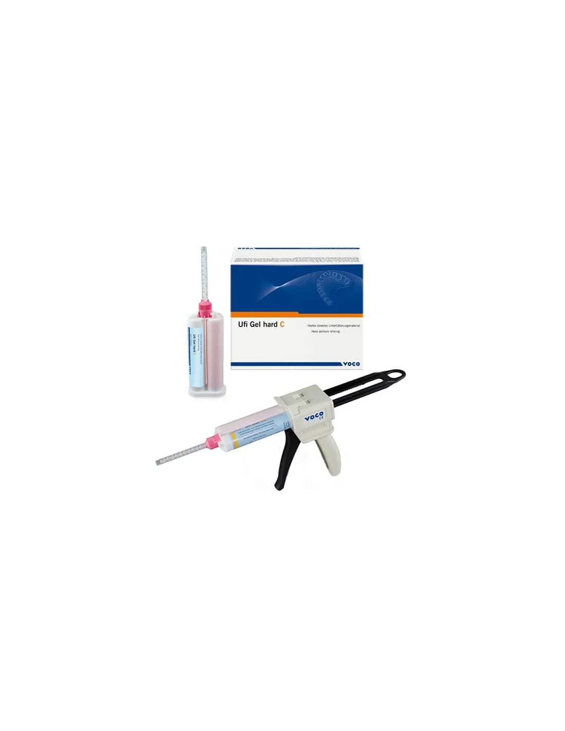 El Kit Intro Ufi Gel Hard C de Voco contiene: cartucho 80 grs., dispensador tipo 2, 10 ml adhesivo, puntas de mezcla tipo 8.