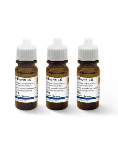 Bifluorid 10 de Voco es una barniz con flúor indicada para el tratamiento de toda clase de hipersensibilidad. Por ejemplo, los cuellos de los dientes y bordes de coronas, tras una limpieza profesional y eliminación de sarro o después de lesiones del esmalte dental. También indicada como protección de dentina/relleno debajo de restauraciones de restauraciones de amalgama.Barniz transparente que no provoca ninguna decoloración de los dientes.
