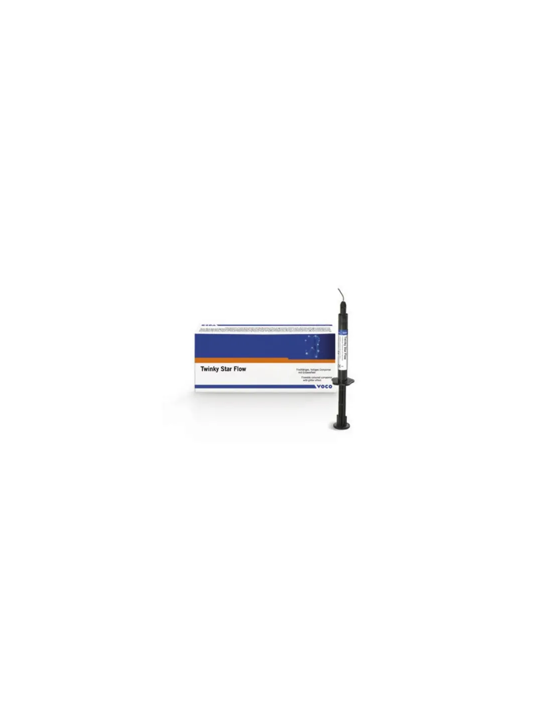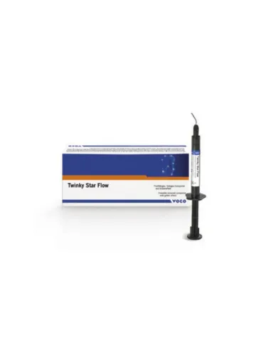 Twinky Star Flow de Voco es un compómero fluido y fotopolimerizable coloreado con efecto brillante. Se utiliza para restaurar dientes provisionales o de leche.
