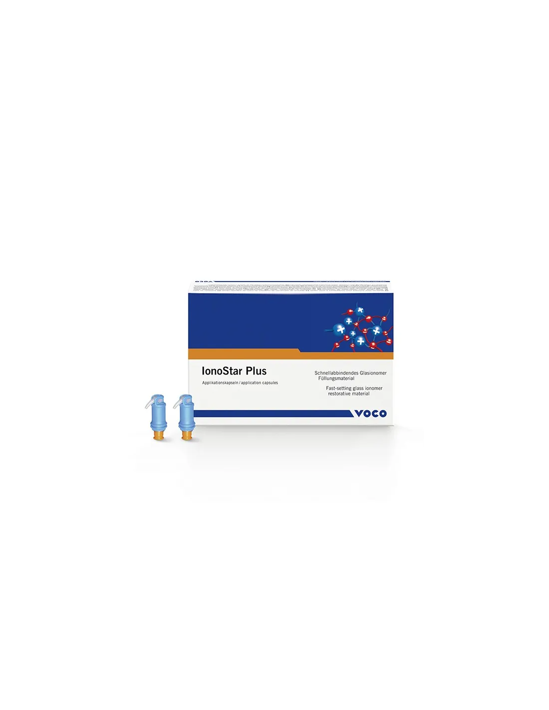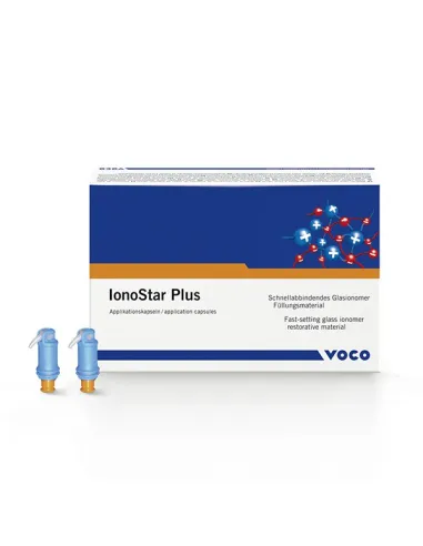 Ionostar Plus de Voco es el primer material de ionómero de vidrio fluorescente, parecido al diente. Se utiliza para la mayoria de las obturaciones (clase I, II y III), restauraciones de dientes de leche y reconstrucciones de muñones.