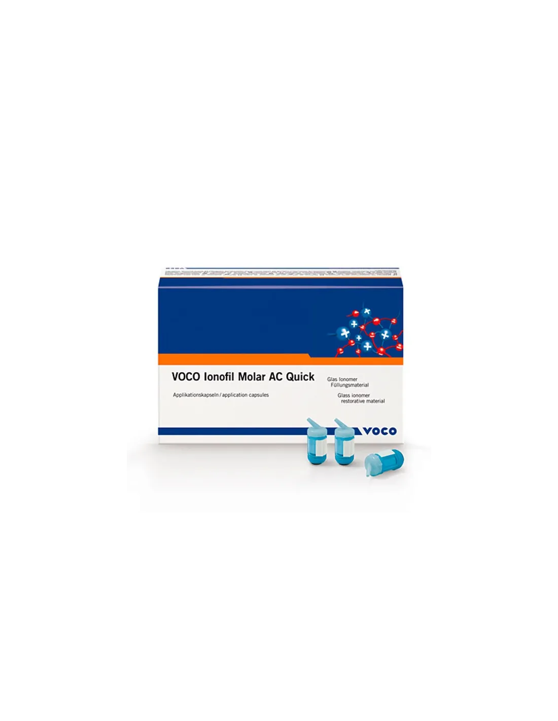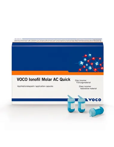 Ionofil Molar AC de Voco es un cemento de ionómero de vidrio para restauraciones, empaquetable en cápsulas de aplicación inmediata. Ionofil Molar AC Quick es su versión de endurecimiento rápido. Gracias a su corto tiempo de endurecimiento de 2'5min, es ideal para el tratamiento de niños o pacientes inquietos.
