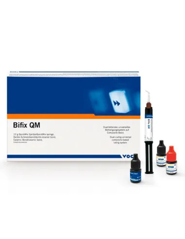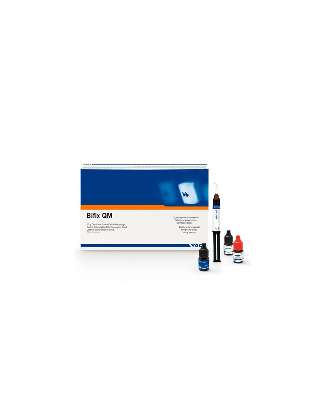 El Bifix QM Kit de Voco contiene: 10 grs. jeringa QuickMix U (universal) + cada uno 4 ml Futurabond DC líquido 1 y 2 + 5 ml Ceramic Bond + puntas de mezcla tipo 11 + puntas intrabucales tipo 4 + accesorios.