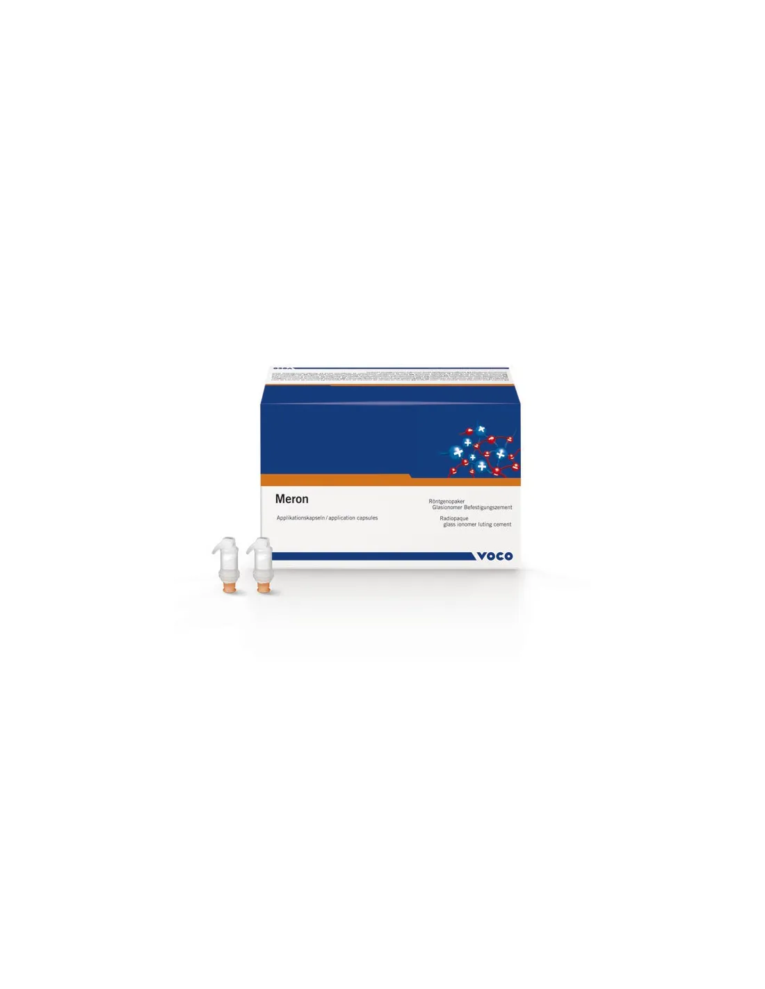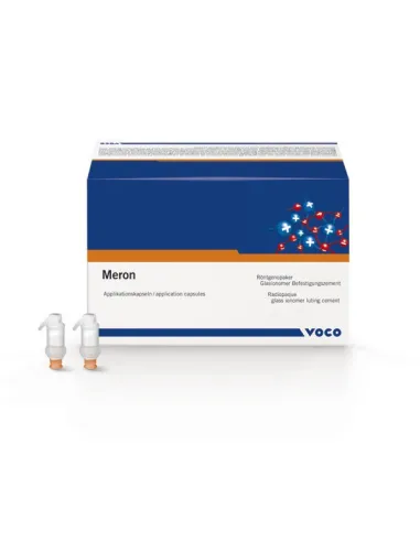 Meron de Voco es un cemento de fijación a base de ionómero de vidrio. Radiopaco. Utilizado para la cementación definitiva de coronas, postes, puentes, inlays, onlays, pins y bandas de ortodoncia.