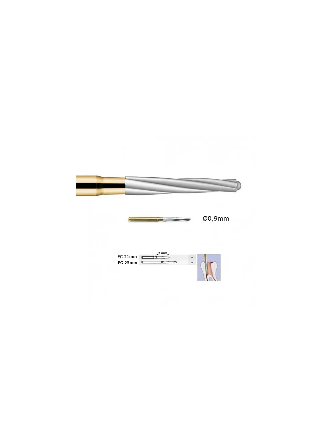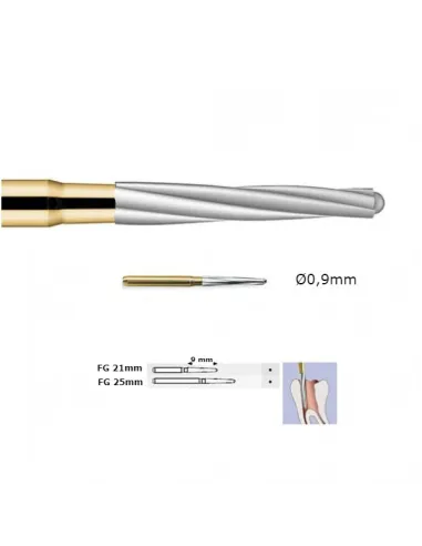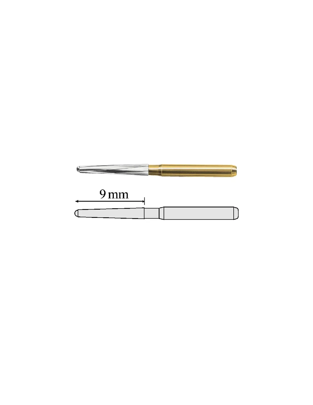 Este instrumento de corte para turbina está fabricado en carburo de tungsteno y está conformado por 6 láminas helicoidales que confluyen en una punta redondeada e inactiva, no cortante, de Ø 0,9mm.