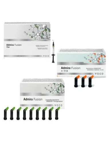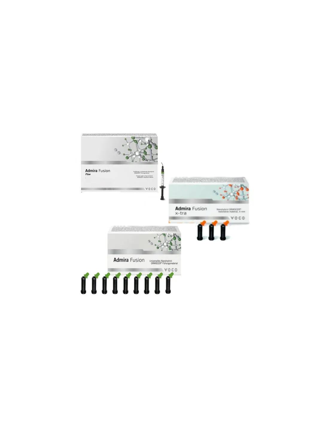 El Pack de Prueba de Admira Fusion contiene: 9 cápsulas de 0,2g (en 3 x A2, A3, A3.5), Admira Fusión Flow 1 jeringa de 2gr. A3 y Admira Fusion x-tra 3 Caps de 0,2 grs. universal + accesorios.