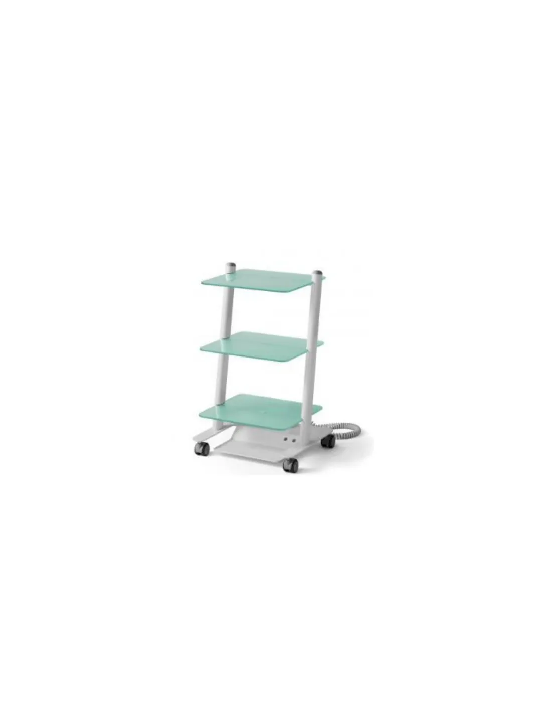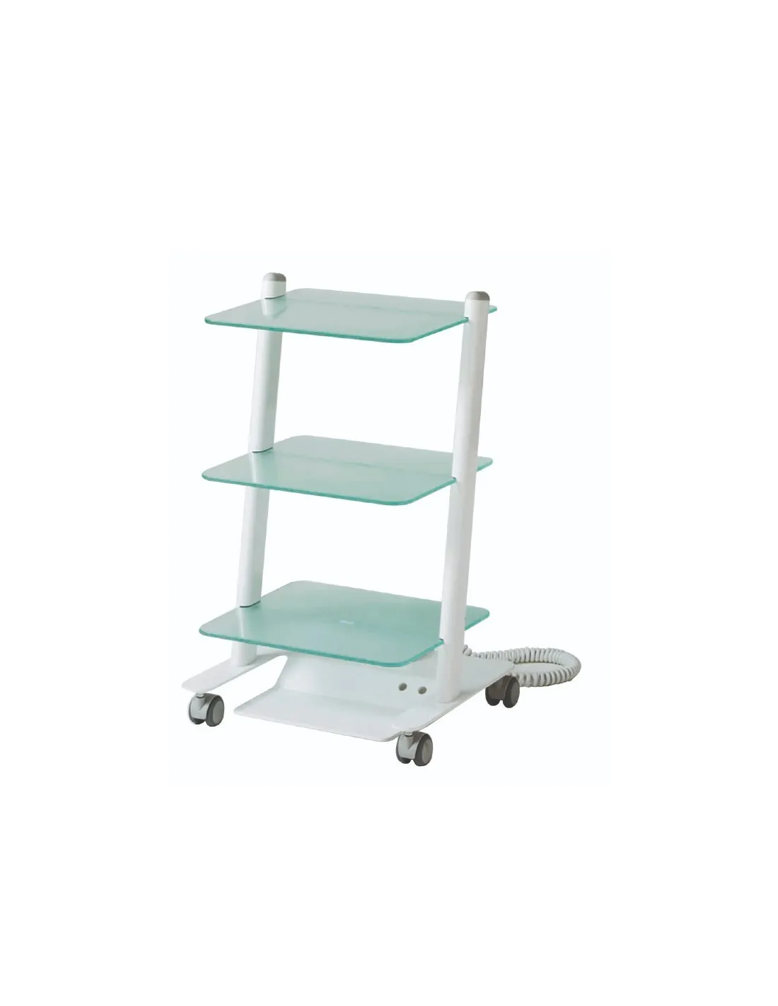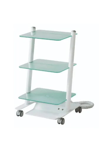 Carrito quirúrgico móvil para clínica C3RGlass de Zilfor con 3 estantes de baldas de vidrio y electrificado con 2 tomas de corriente.