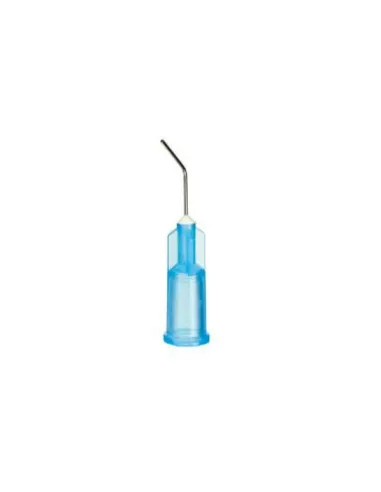 Con cuerpo de plástico azul claro posee una aguja metálica roma y curvada para una aplicación de los materiales por su cánula estrecha de forma precisa y controlada.