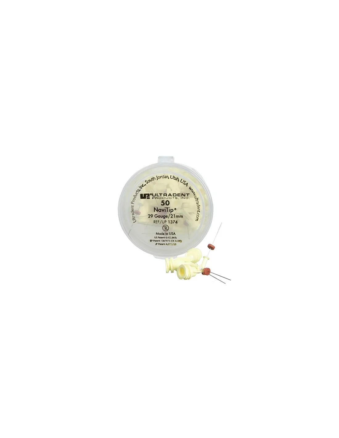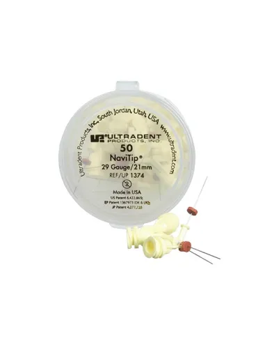 El envase de 50 unidades de las puntas NaviTip calibre 29GA/Ø 0,33 mm. de Ultradent esta disponible en longitud de: 21 mm y 25 mm.