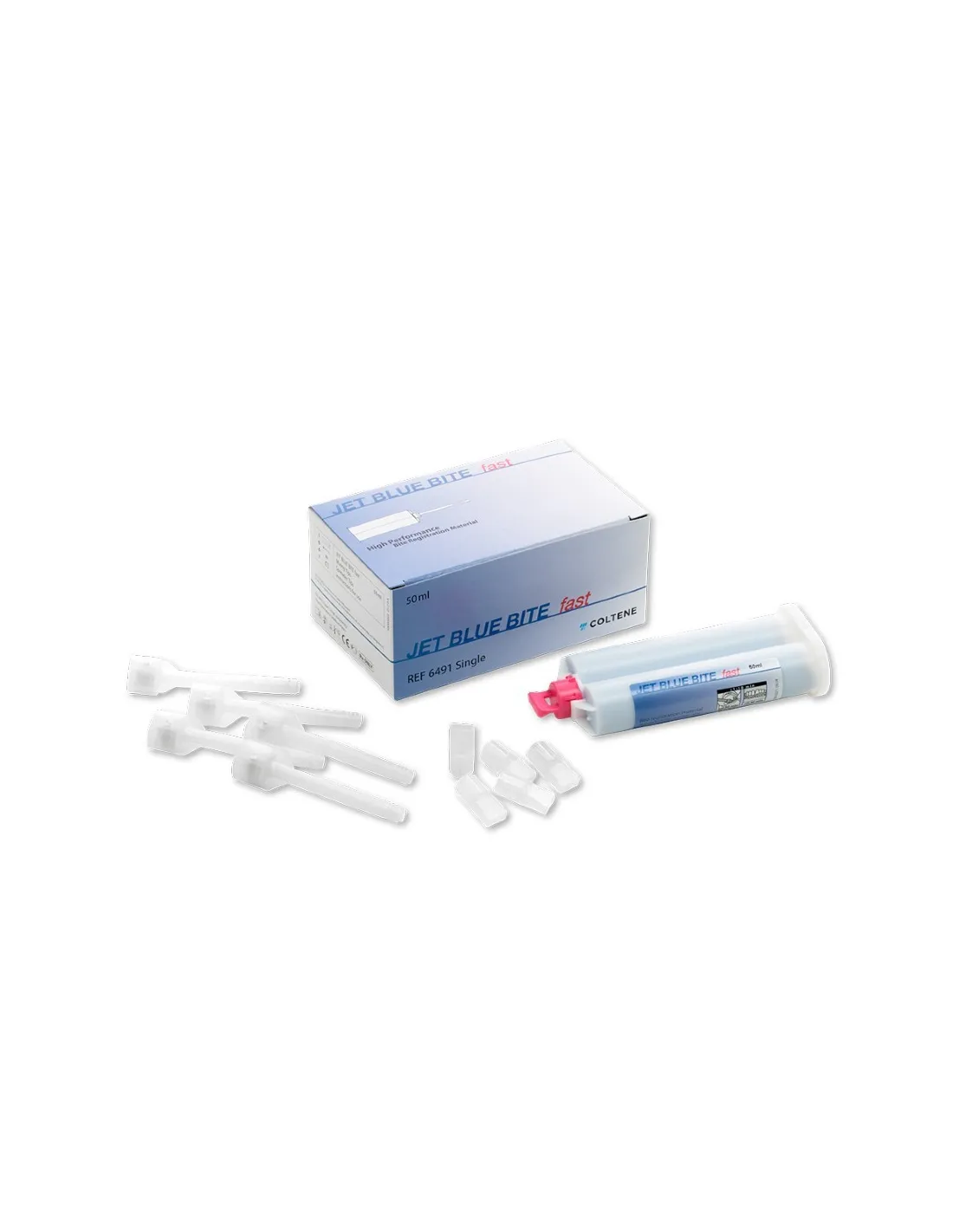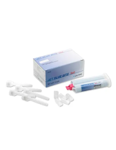 El envase de Single Pack de Jet Blue Bite de Coltene contiene: 1 cartucho de 50ml. + puntas.