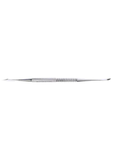 Consta de dos partes activas, una parte con forma de cuchilla de mediano tamaño ligeramente angulada y otra parte, con forma de espátula ligeramente curvada.