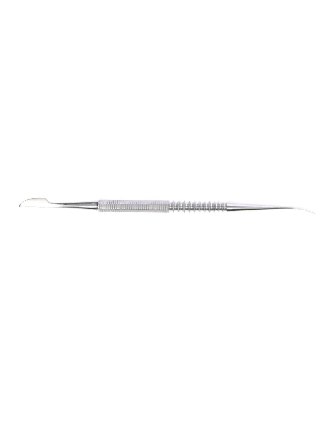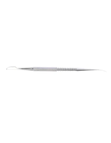 Consta de dos partes activas, una parte con forma de cuchilla estrecha y alargada, apenas angulada y otra parte, con forma de espátula ligeramente curvada.