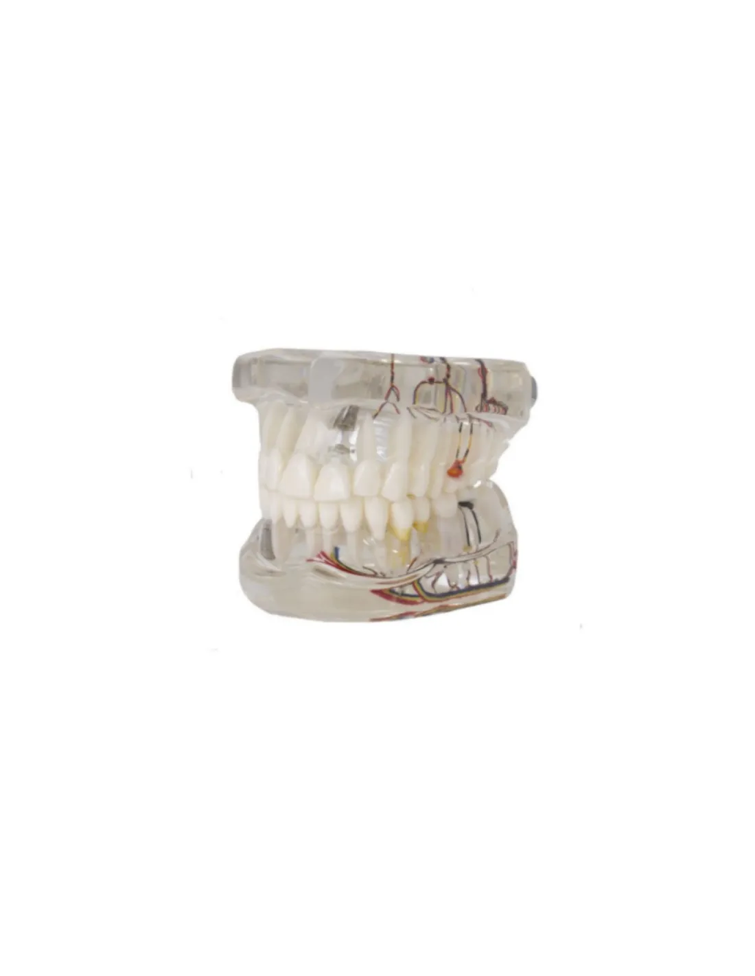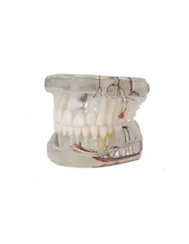 Modelo realista con algunos dientes desmontables y de color transparente para poder visualizar con facilidad el correcto trazado del nervio.