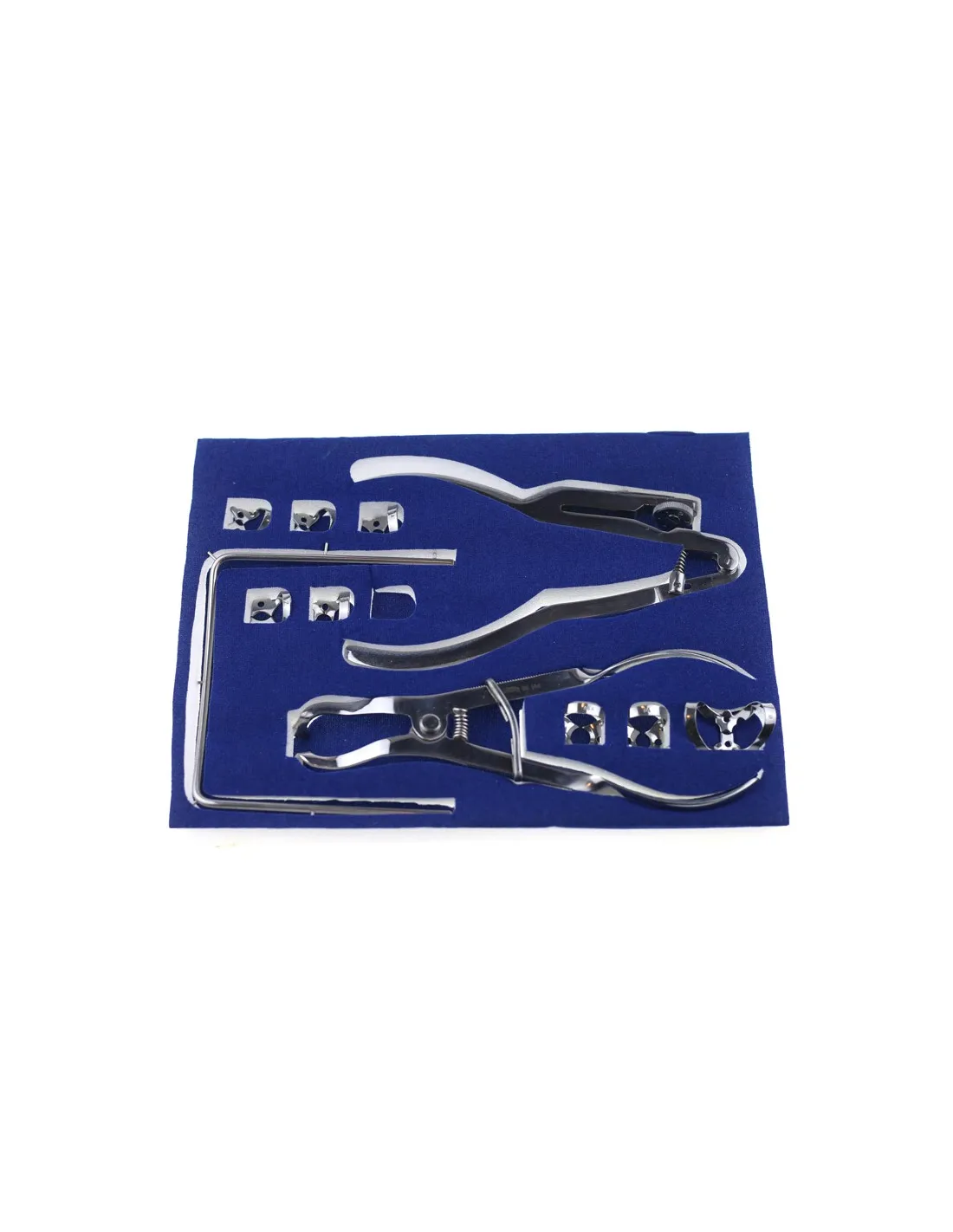 - Perforador de dique: instrumento similar a un alicate que produce un corte circular en el dique de diferentes diámetros. Modelo Ivory.