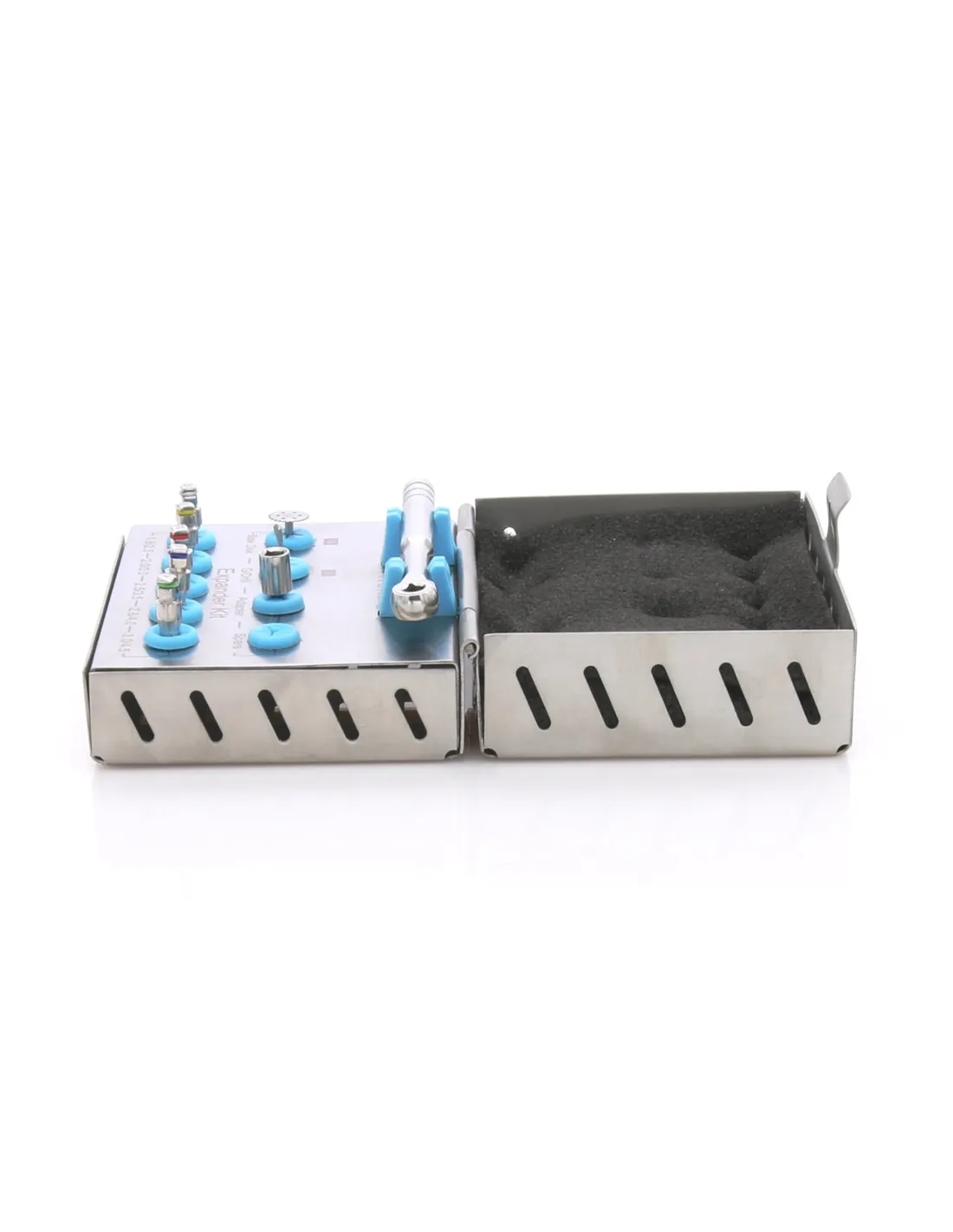 El kit de expansión ósea de Masters incluye: 5 expansores de diferentes diámetros, 1 llave, 1 taladro, 1 adaptador y cuchilla dentada.