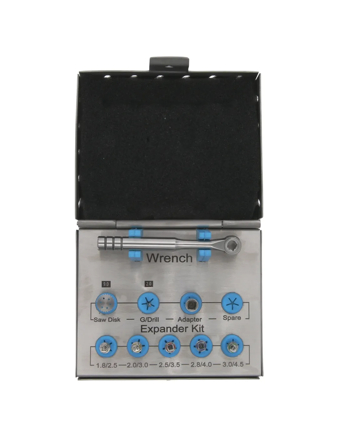 - 5 expansores óseos de distintos tamaños. 1.8/2.5 mm, 2.0/3.0 mm, 2.5/3.5 mm, 2.8/4.0 mm y 3.0/4.5 mm.