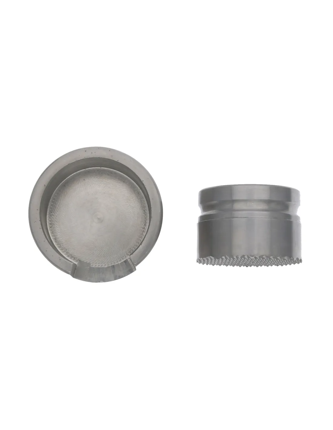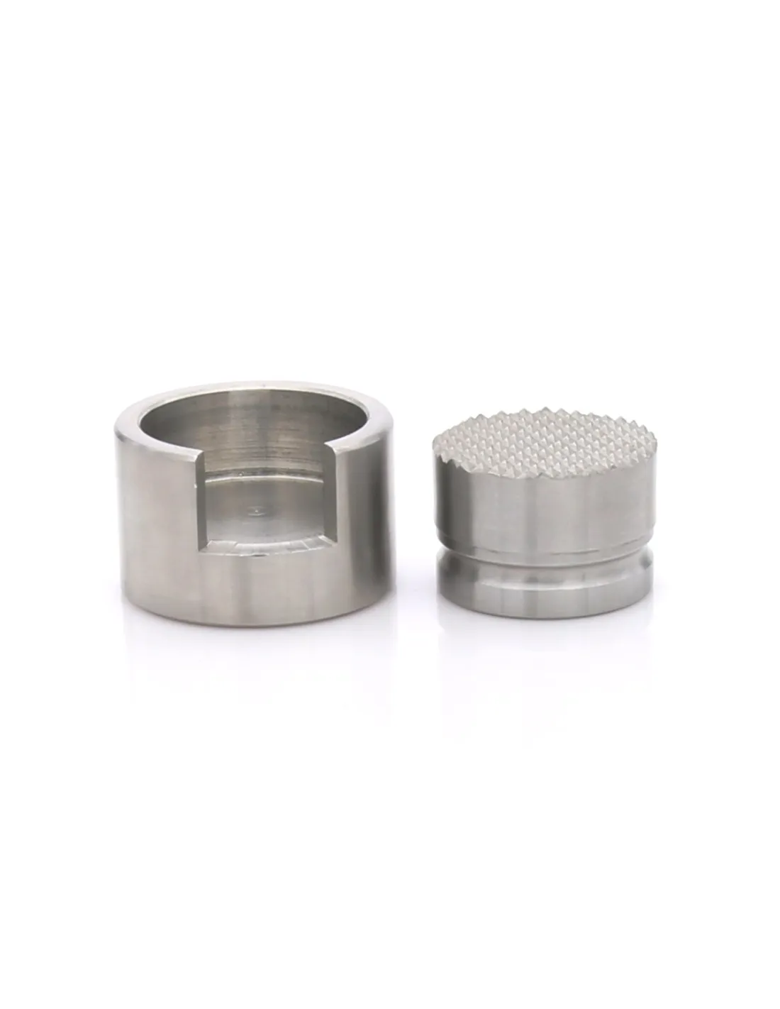 Coloque el hueso en el pozo del instrumento. Cubra el hueso con la tapa con el lado serrado hacía abajo. Utilice el martillo para reducir al tamaño deseado.