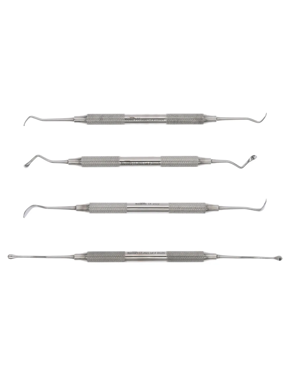 El Kit de Elevación de Seno de Masters es un kit que contiene 4 instrumentos de implantología con doble parte activa, que se utilizan para separar la membrana de Schneider del hueso maxilar y elevar la membrana.
