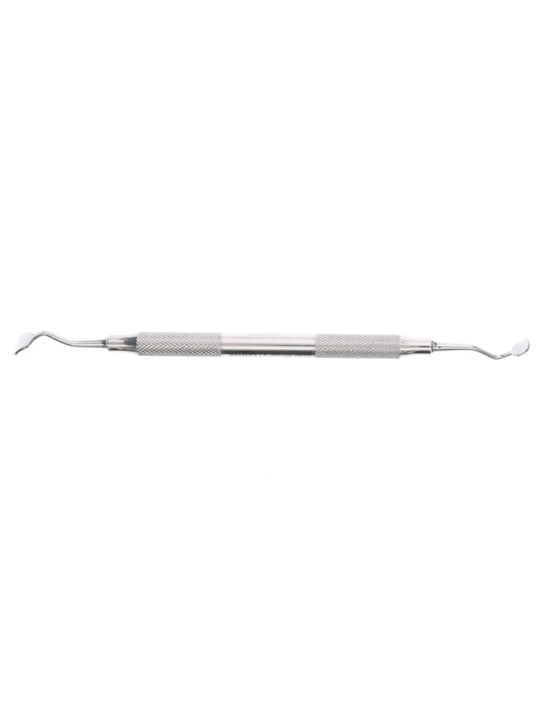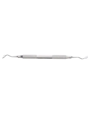 Cincel curvado con doble parte activa de diferentes medidas: 7mm y 5mm, respectivamente que tienen la forma de una paleta curvada con canto redondeado.