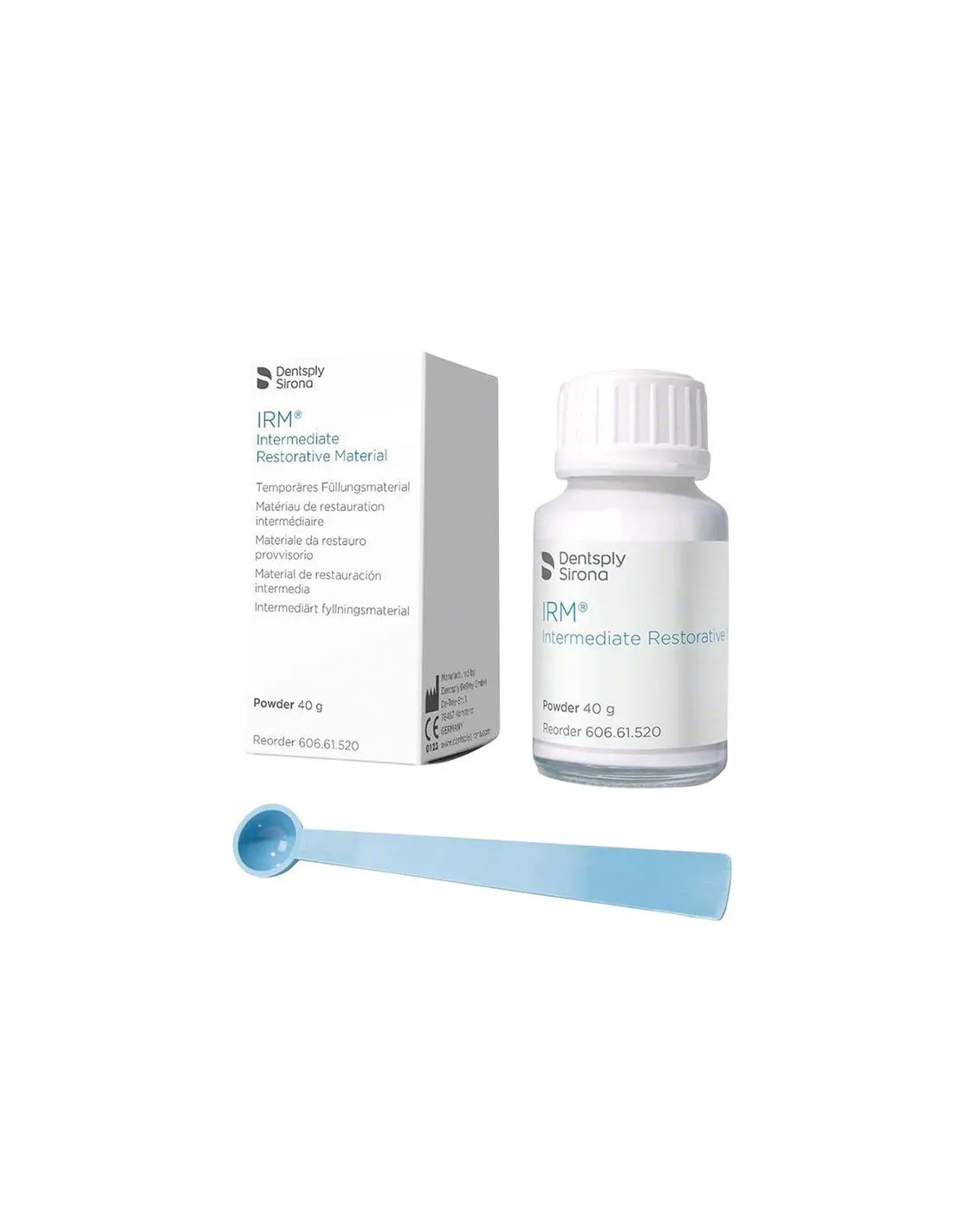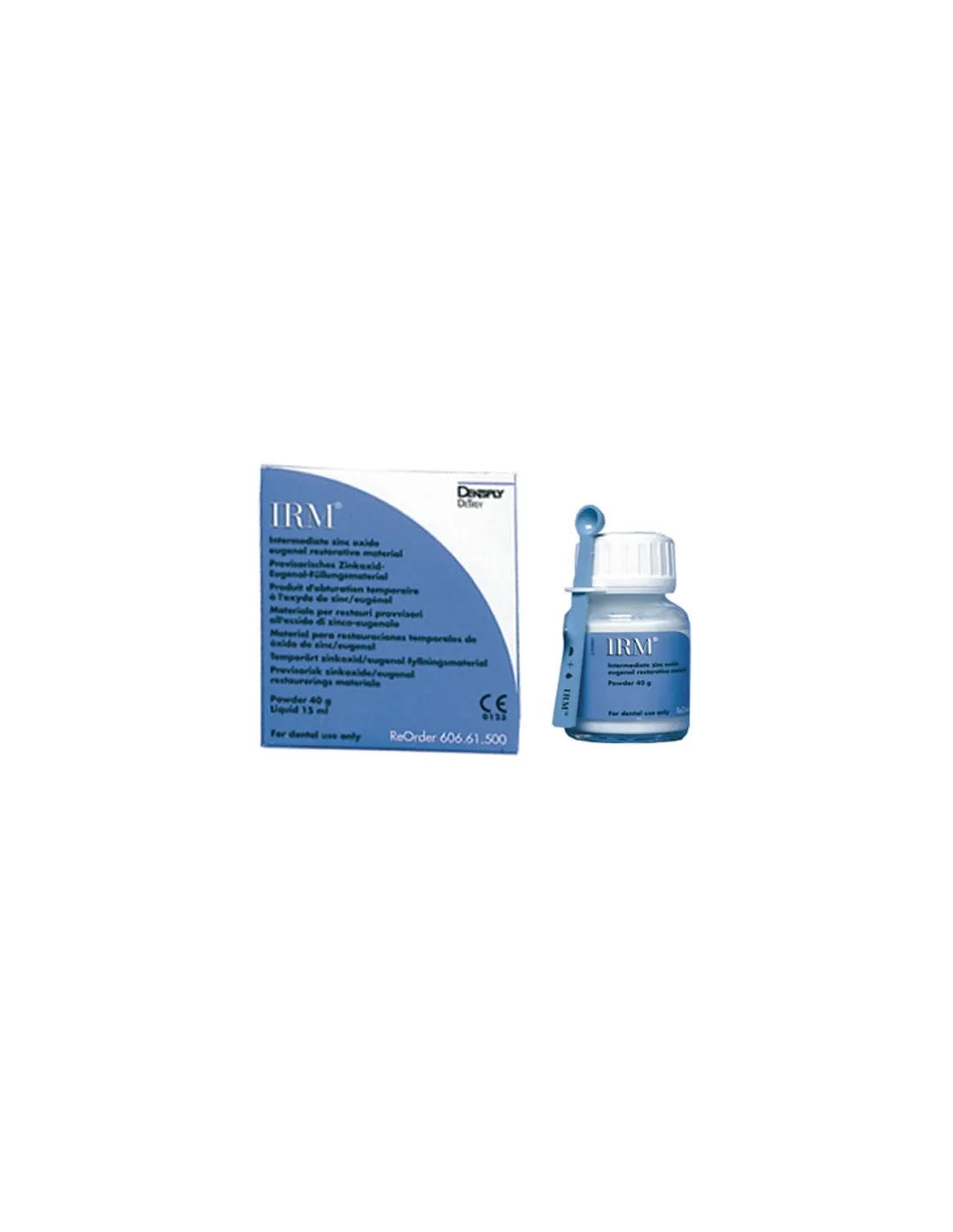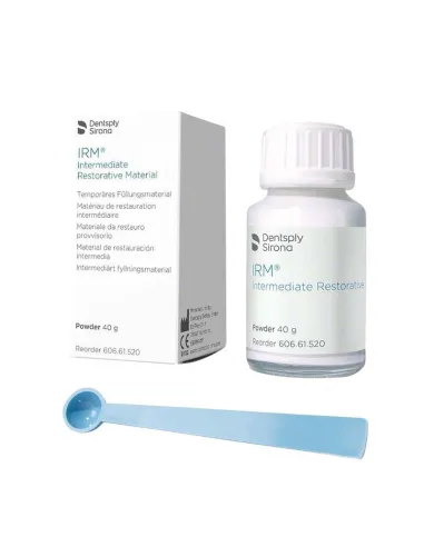 IRM es un material que se usa como base cavitaria o como material de obturación temporal y está compuesta por óxido de zinc y eugenol reforzada con polímeros. Posee una gran resistencia mecánica.