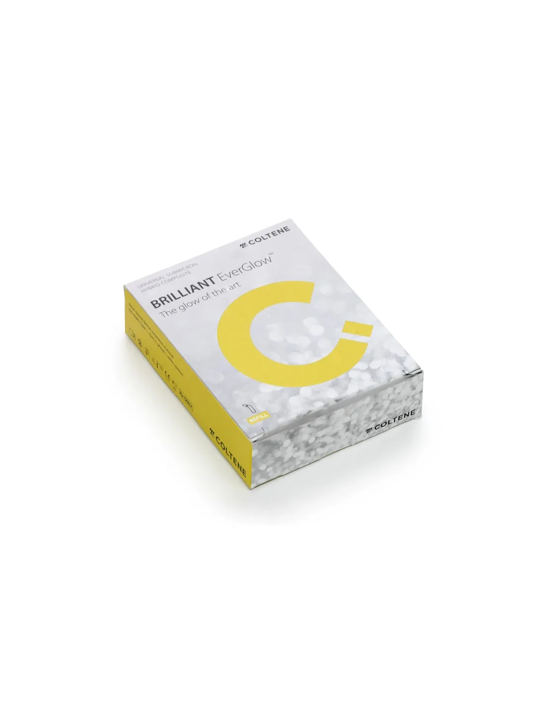 Brilliant Everglow de Coltène es un composite híbrido submicrónico universal de alto relleno; con un intervalo de partículas de relleno inorgánicas de 0,02-1,5µm., con un contenido de relleno inorgánico por volumen de 56% y por peso de 74%.