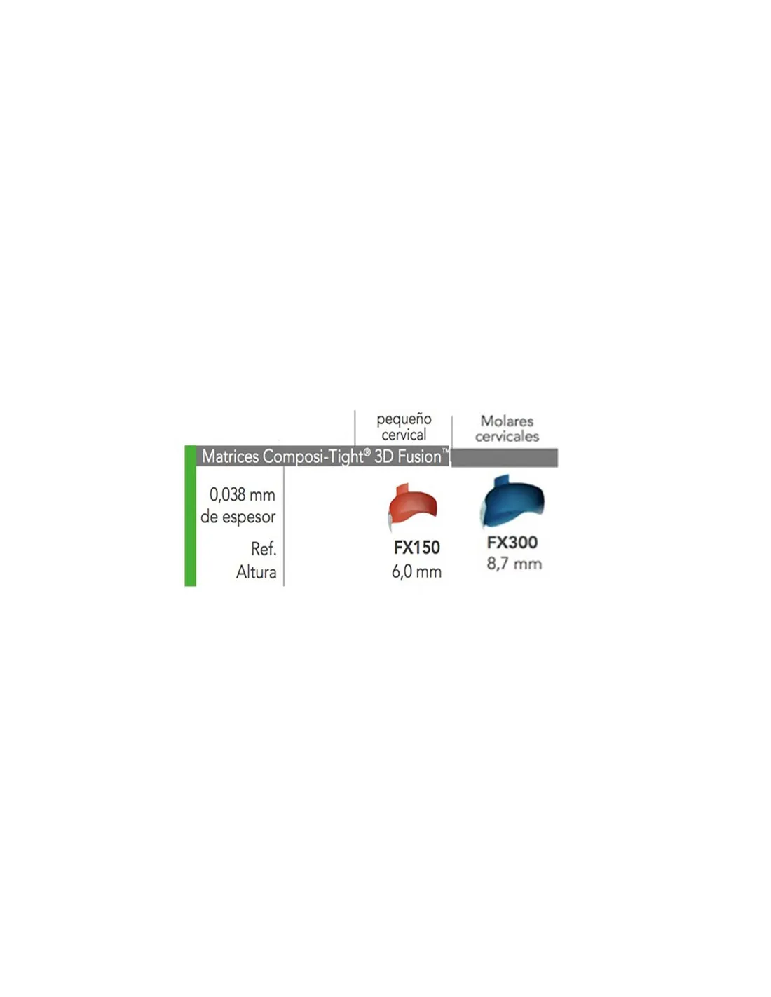 Las matrices son preformadas y extrasuaves. De 0,038mm de espesor en acero inoxidable ultrafino.