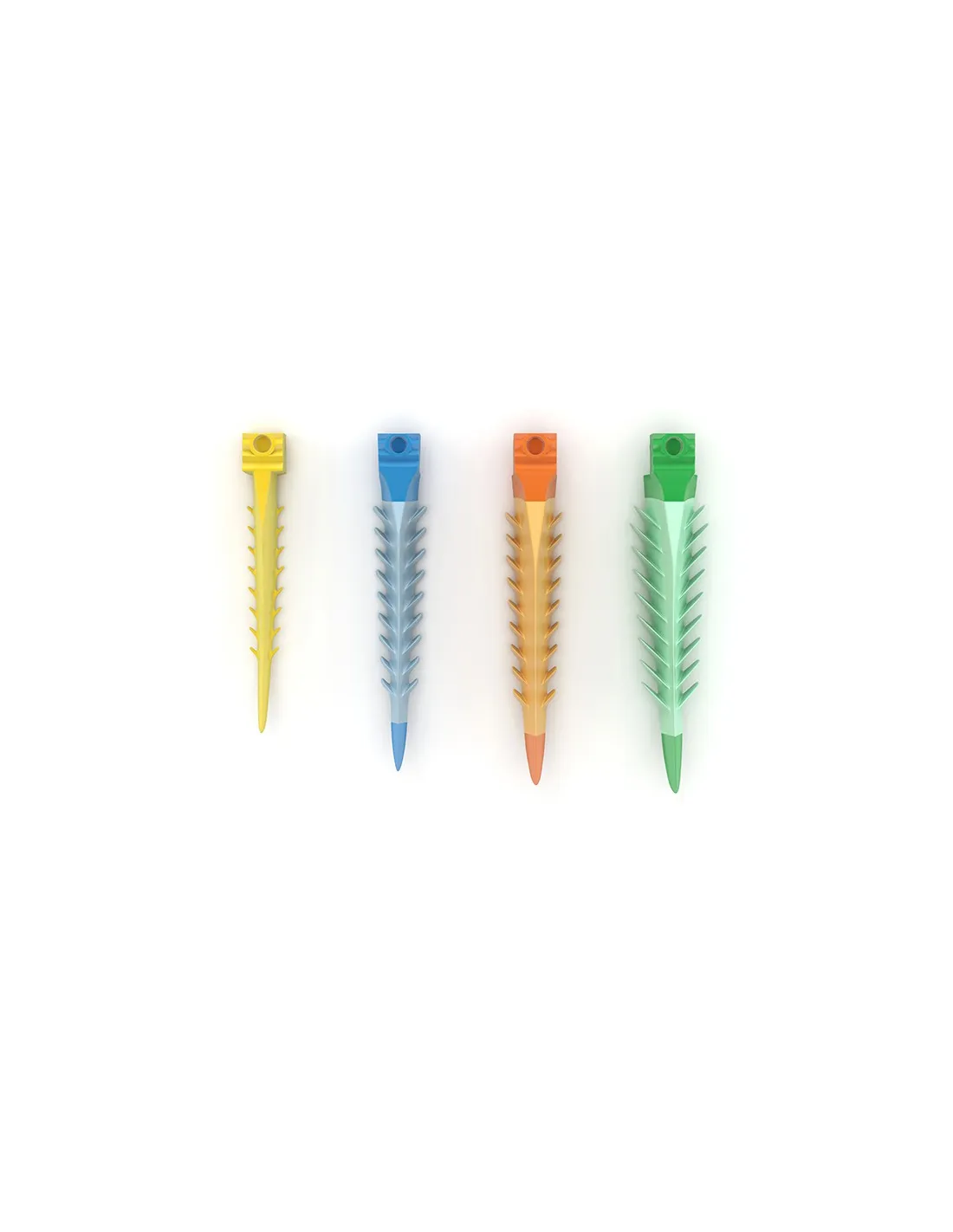 - Aletas retentivas blandas que facilitan la inserción y extracción.